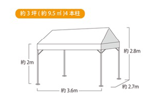 | 全テント共通追加設備 | 椅子 750円/1脚 机 2,500円/1台 電力 15,000円/1500W テント横幕 (透明ビニール幕1枚/1,500円、白幕1枚/2,500円) ※その他レンタル可能な設備もございますのでご相談ください。 |